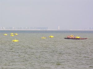 Surprisingly, for most metals, concentrations in mussels the Eastern Scheldt bay were equally high as those in the Western Scheldt estuary. Concentrations were: arsenicum: 7 - 20 µg/g, cobalt: 0.8 - 2.2 µg/g, copper: 5 - 22 µg/g, manganese: 5 - 20 µg/g, lead: 2 - 6.1 µg/g, cadmium 1 - 1.8 µg/g, chrome: 1 - 2 µg/g, iron: 70 - 200 µg/g, nickel: 0.5 - 5 µg/g, zinc: 50 - 150 µg/g (al in µg metal/ g mussel, wet weight). Heavy metal concentrations in mussels showed both in the Western Scheldt estuary as in the Eastern Scheldt bay a decreasing trend towards the sea.