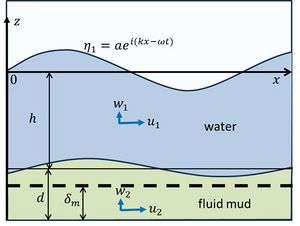 Based on a linearized 2-layer model, Ng (2000[21]) established an analytical expression for the damping length scale [math]k_i^{-1}[/math] of a wave propagating over a seabed covered by a thin fluid mud layer of depth [math]d[/math]. The propagating surface wave is represented by