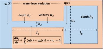 The current velocity [math]u[/math] in the entrance channel is driven by the difference between the free-surface elevation at the offshore boundary and that within the basin. The velocity consists of a tidal component of amplitude [math]U[/math] and a much smaller component [math]u_c[/math] associated with the resonant Helmholz oscillation of the harbor. The pressure-gradient forcing is partly balanced by bottom friction. Since the tidal velocity dominates, the friction term can be linearized, yielding a linear momentum balance for [math]u_c[/math],