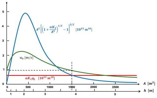 [math]K_1 \, q_L = b^4 h^6 \, \Bigg[ \Big( 1 + \dfrac{K_2}{b^4 h^6} \Big)^{1/2} - 1 \Bigg]^{3/2} \, , \qquad K_1 = \dfrac{3 \pi}{4 \sqrt{2}} \dfrac{\Delta \rho}{\rho} \dfrac{(\sqrt{c_D}\omega S l)^3}{g^2}\, , \qquad K_2=\Big(\sqrt{\dfrac{2 c_D a_0 l}{g}} \omega S\Big)^4 \, . \qquad (A11) [/math]