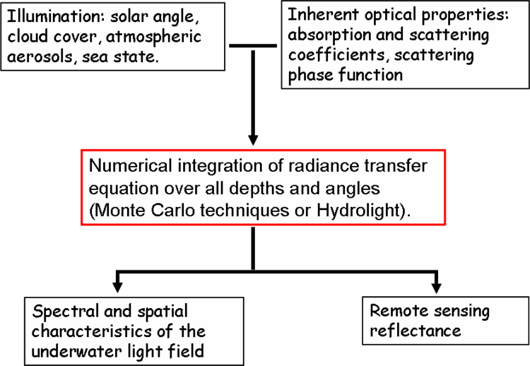 In which: L*(z,q,f) represents the gain in radiance due to light scattered from adjacent paths and S(z,q,f) accounts for any internal sources. In coastal waters, the most important internal source terms arise from Raman scattering by water molecules and fluorescence from dissolved organic matter and phytoplankton pigments. For light-field modelling the radiative transfer equation is solved numerically using either Monte Carlo methods or more conceptually sophisticated mathematical techniques (Mobley 1994<ref name="mob"/>, Thomas and Stamnes 1999<ref>Thomas G E.and Stamnes K 1999 Radiative transfer in the atmosphere and ocean, Cambridge, New York, Cambridge University Press 517 p., ISBN 0521401240.</ref>). The discrete ordinates method is commonly used in optical oceanography and is implemented in the commercially available Hydrolight software package (Sequoia Scientific). In order to construct a light field model, it is necessary to specify the nature of the input illumination, the IOPs of the medium, and any internal source functions (Figure 2). Light field models can generate a complete set of radiance values, but their output is usually summarised as a set of AOPs and reflectances which corresponds to those most frequently measured. | In which: L*(z,q,f) represents the gain in radiance due to light scattered from adjacent paths and S(z,q,f) accounts for any internal sources. In coastal waters, the most important internal source terms arise from Raman scattering by water molecules and fluorescence from dissolved organic matter and phytoplankton pigments. For light-field modelling the radiative transfer equation is solved numerically using either Monte Carlo methods or more conceptually sophisticated mathematical techniques (Mobley 1994<ref name="mob"/>, Thomas and Stamnes 1999<ref>Thomas G E.and Stamnes K 1999 Radiative transfer in the atmosphere and ocean, Cambridge, New York, Cambridge University Press 517 p., ISBN 0521401240.</ref>). The discrete ordinates method is commonly used in optical oceanography and is implemented in the commercially available Hydrolight software package (Sequoia Scientific). In order to construct a light field model, it is necessary to specify the nature of the input illumination, the IOPs of the medium, and any internal source functions (Figure 2). Light field models can generate a complete set of radiance values, but their output is usually summarised as a set of AOPs and reflectances which corresponds to those most frequently measured. | ||