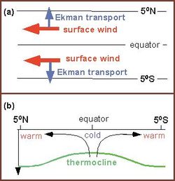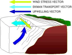 Upwelling is a phenomenon that involves wind-driven motion of dense, cooler, and usually nutrient-rich water towards the ocean surface. This water replaces the warmer, usually nutrient-poor surface water. There are several types of upwelling: coastal, equatorial, large scale upwelling in the Southern Ocean, tropical cyclone and non-oceanic (in other fluid environments such as magma) upwelling. Coastal upwelling is the best known type of upwelling. The wind blows parallel to the western coasts of continents and drive surface waters away from the coast (Ekman effect). This surface water is replaces by deep, cold water, which is rich in nutrients and [math]CO_2[/math]. This causes a high primary production. Upwelling creates more phytoplankton, which creates in their turn rich fish stocks. The most productive areas of the ocean are characterized by upwelling. [9] At the opposite coast, downwelling is present. The thermocline also rises at the time upwelling is appearing and it is decreasing at the time downwelling is appearing. Downwelling causes water to sink and the water takes the nutrients with it.