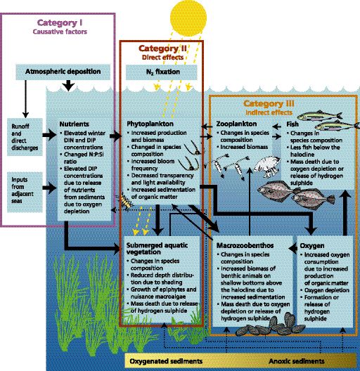 - It’s about increased productivity (conversion of light and carbon dioxide into living organic matter – a process being limited by nitrogen and/or phosphorus) and unacceptable ecological effects as algal blooms, oxygen depletion, kills of benthic animals and fish