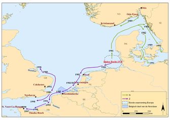 | + | Kaart: VLIZ (naar Severijns (2002) <ref name = 11a>Severijns, N. (2002). Verspreiding van de Amerikaanse zwaardschede ''Ensis directus'' (Conrad, 1843) in Europa 23 jaar na de introductie: opmerkelijke opmars van een immigrant Gloria Maris 40(4-5): 63-111. [http://www.vliz.be/imis/imis.php?module=ref&refid=23304 details]</ref>)</div>]] | ||