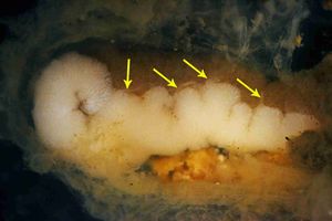 | + | [[Image:Molgula manhattensis multiple spermducts.jpg|thumb|right|300px| <div style="text-align: center;"> Het spermduct (het witte orgaan op de foto) van Molgula manhattensis heeft meerdere uitgangskanalen die staan aangegeven met de pijlen. Dit is een diagnostisch kenmerk waarmee deze soort van andere Molgula soorten kan worden onderscheiden, waaronder ook M. socialis, die maar 1 spermduct uitgang heeft. | ||
