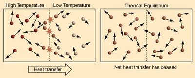 [[Image: entropy.jpg| thumb| 400px|right|The above illustration summarizes the situation when the kinetic temperature gives a reasonable general description of the nature of temperature. For monoatomic gases acting like point masses, a higher temperature simply implies higher average kinetic energy]]