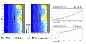 This method is illustrated by a case which is discussed in more detail in Johnson et al (2005)[4]. The concept of this method is to simulate the events, which contribute significantly to the morphological development only. The project site is shown in Fig. 2. It is a sandy, moderately exposed coast. The example focuses on sedimentation behind a shore parallel breakwater. Fig. 3 shows the bathymetries as measured in March 1995 and in January 1997, i.e. a period which is too long for morphological modelling within a reasonable time frame.