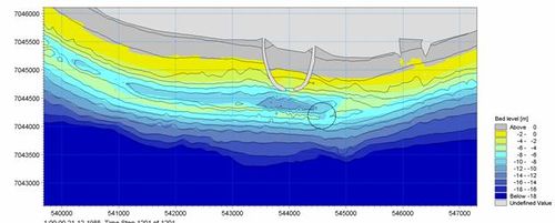 The morphological models have proven very useful to predict the changes in the morphology due to major changes such as construction of groynes, breakwaters, revetments or harbours in the coastal zone. One way of using the models is to study the bathymetry which will develop under constant wave action after a long time period. Fig. 8 shows the result of morphological modelling of the bathymetry around the harbour shown in Figs. 6 and 7. The driving force is now constant waves from south east. The wave driven currents will concentrate around the harbour and with time an equilibrium depth will develop which allows the amount of sand fed in from the up-drift side to bypass the harbour. In the present case it appears after some modifications that an equilibrium depth of approximately 8 m will develop in front of the present harbour.