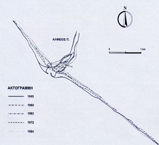 Figure 4. Shoreline retreat of the Mouth area of R. Alfios following the construction of dams (Ghionis et al., 2005)