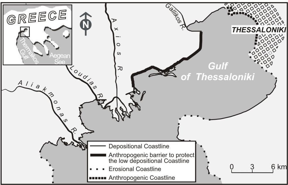 (Figure 1. Location of the study area together with the type of coasts found in the North Thermaikos Gulf and the Thessaloniki Bay.) |
