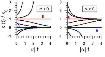 It becomes clear that the system has two equilibrium positions, (A): <math>x=0</math>, and (B): <math>x=x_c</math>. Moreover, for <math> \alpha > 0</math>, (A) is stable while (B) is unstable. In contrast, (A) is unstble and (B) is stable for <math> \alpha < 0 </math>. This is ilustrated by Fig. 1 where typical <math>x(t)</math> solutions | It becomes clear that the system has two equilibrium positions, (A): <math>x=0</math>, and (B): <math>x=x_c</math>. Moreover, for <math> \alpha > 0</math>, (A) is stable while (B) is unstable. In contrast, (A) is unstble and (B) is stable for <math> \alpha < 0 </math>. This is ilustrated by Fig. 1 where typical <math>x(t)</math> solutions | ||