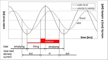 These three mechanisms are illustrated below for an estuary, where salinity variations are more or less in phase with ebbing and flooding of the tide. In general, water level and tidal velocity are out of phase, and in the following we assume a phase difference of [math]45^{\circ}[/math]. During flood, flow separation occurs at the down-estuary side of the harbor basin, and the wake is deflected into the basin during rising tide, and out of the basin during falling tide. Thus, relatively, little water is exchanged during falling water and ebb, which is therefore neglected in this zero-order estimation. Tidal filling is in phase with rising and falling water. The salinity in the estuary in front of the harbor basin is more or less in phase with flood and ebb – for a harbor basin situated down-estuary (close to the sea) salinity in the estuary is larger than in the basin during flood, while the opposite is true during ebb. Hence, a near-bed sediment-rich density current flows into the basin during flood, while, owing to siltation in the basin, a near-bed sediment-poor density current flows out of the basin during ebb. This phasing is sketched in Fig. 2, showing that sediment import into a harbor basin is unevenly distributed over a tidal period.
