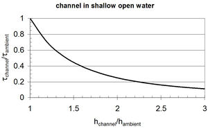 [math]\frac{\hat \tau_{b,c}}{\hat \tau_{b,\infty}}= \left ( \frac{u_{b,c}}{u_{b,\infty}} \right )^2=\left ( \frac{\sinh kh_{\infty}}{\sinh kh_c} \right )^2 \approx \left ( \frac{h_{\infty}}{h_c} \right )^2 , \qquad(7) [/math]