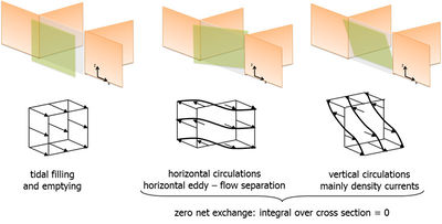 where [math]\lt Q_t\gt [/math] is the gross water exchange by tidal filling (angular brackets implies averaging over tidal period), [math]\lt Q_e\gt [/math] is the gross water exchange by horizontal circulation (entrainment), and [math]\lt Q_d\gt [/math] is the gross water exchange by density currents.