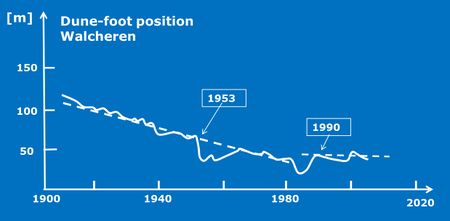 Fig. 7. Variation of the dune foot position in a beach transect of the island Walcheren (Netherlands) over the period 1900-2010 (solid white line, based on annual surveys of Rijkswaterstaat [15]). The trend is indicated by the dashed line, showing ongoing retreat of the dune foot from 1900-1990. The large dune erosion by the exceptional 1953 storm surge has no influence on the long-term trend of dune foot retreat. Stabilization after 1990 is due to implementation of the current 'hold-the-line' coastal policy by sand nourishments. |