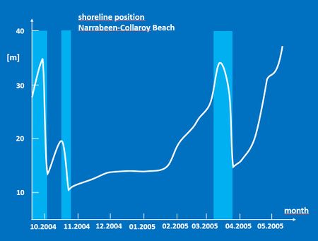 | + | [[File:NarrabeenCollaroyBeachShorelineRecovery.jpg|thumb|left|450px| Figure 8. Variation of the shoreline position in a transect of Narrabeen-Collaroy Beach (East Australia, near Sidney) over the period October 2004-May 2005. Strong shoreline retreat occurs during the storm periods indicated in light blue. After-storm recovery occurs during the periods in between. Figure redrafted after <ref name=Ph></ref>.]] | ||