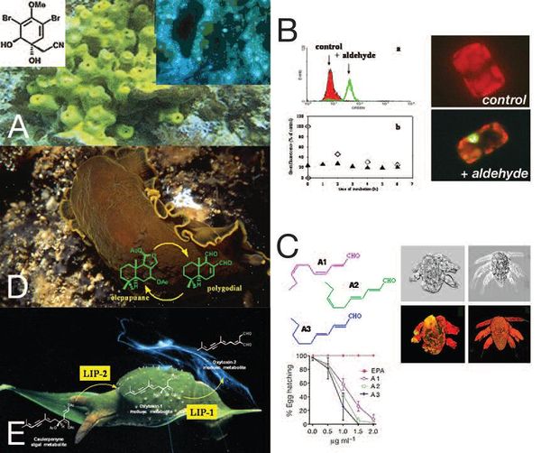 The sponge [http://www.marinespecies.org/aphia.php?p=taxdetails&id=133911 ''Aplysina aerophoba''] produces the anti-microbial and anti-tumour compound Aplysinin-1. Staining with DAPI reveals the rich microbial fauna associated with the sponge. B. The effect of diatom-derived unsaturated aldehydes on diatoms (a) [http://www.marinespecies.org/aphia.php?p=taxdetails&id=175584 Phaeodactylum tricornutum] and (b) [http://www.marinespecies.org/aphia.php?p=taxdetails&id=163513 Thalassiosira weissflogii]. C. The effect of the diatom-derived unsaturated aldehydes 2-trans-4- cis-decatrienal (A1), 2-trans-4-trans-7-cis-decatrienal (A2) and 2-trans-4trans-decadienal (A3) on copepod hatching success (Miralto et al., 1999; Ianora et al., 2004a). D,E. Transformation of caulerpenyne in the allomonal oxytoxins by lipolytic enzymes, named Lip-1 (Lipase 1) and Lip-2 (Lipase 2), in Oxynoe olivacea (from Cutignano et al., 2004).</div>]]