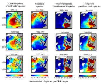 | + | [[Image:CPR.graph.PNG|thumb|350px|right|Changes in the mean number of copepod species from 1951-2002, showing northward extension of warm water species and northward retreat of cold water species. Recalculated after Beaugrand et al., 2002.]] | ||