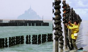| + | [[File:MytilicultureSaintMichel.jpg|thumb|left|300px|Fig. 2. Mussel farm in Baie du Mont Saint Michel (France). Mussel cultivating takes place on poles (bouchots) drilled deep into the seabed. For seed collection, a coconut fiber rope is wrapped in a spiral around the post. When time comes for grow-out, a netting material is added to prevent fall off. ]] | ||