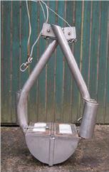 [11]The Raillier-du-Baty dredge is designed to work in a range of substrata from sands to cobbles. It consists of a robust metal ring attached to a central towing arm. An open ended bag of the desired mesh size is attached to the ring, and the trailing end of the bag is tied to prevent loss of material during collection of the sample. This inner bag is protected by an outer, coarser bag which is, in turn, enclosed by a heavy duty apron of fishing net, in order to reduce chafing. The warp is attached to a fixing point on the metal ring, and a weak link is placed between this point and the central arm. This optimizes the digging capability of the edge of the ring and reduces the chances of the edge being lifted away from the seabed.