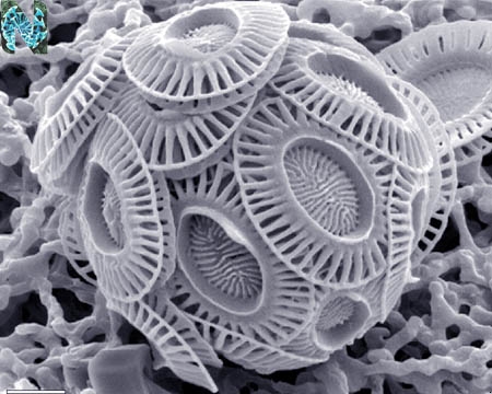 The coccolithophorid Emiliania huxleyi var. corona. Image taken by Claudia Sprengel & Jeremy Young, provided courtesy of Plankton*Net3 (image # 56470). Plankton*Net Data Provider at the Alfred Wegener Insitute for Polar and Marine Research hdl: 10013/de.awi.planktonnet