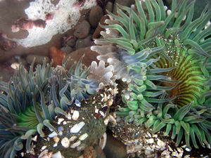 | + | [[Image:800px-Clone war of sea anemones 2-17-08-2.jpg|thumb|right|Sea Anemones, ''Anthopleura sola'' are engaged in a war for the territory. The white tentacles are fighting tentacles. They are called acrorhagi. The acrorhagi contain concentration of stinging cells. After war ends one of Sea Anemone, should move. Sea Anemones look as plants, but they are animals and they are predators. The image was taken in Northern California. Source:[http://en.wikipedia.org/wiki/File:Clone_war_of_sea_anemones_2-17-08-2.jpg Wikipedia]]] | ||