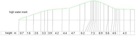 Figure 4 clearly shows that for each mean discharge there are only a small number of waves that give large overtopping volumes. The general behaviour of wave overtopping can be described by a large number of fairly small overtopping waves and a few which are much bigger. These few but bigger waves often cause the damage to the inner slope. In the first years of testing it appeared to be very difficult to measure any hydraulic parameter on the inner slope, like flow velocity or flow depth. The velocities can approach 8 m/s and the water is very turbulent with a lot of air entrainment (estimated to be about 10%). The maximum flow depth is about 0.25 m. It is assumed that the front velocity is similar to the maximum depth averaged velocity and that flow velocity and flow depth have the same shape of record in time. Wave overtopping may lead to failure of the crest and inner slope of a dike. In principle there are two different failure mechanisms. Fast overtopping water may damage the surface of the crest and inner slope and, if initial damage or erosion has occurred, this may continue to the layer underneath the grass cover and may lead to an initial breach. This is actually the process which is simulated by the Wave Overtopping Simulator: erosion of the slope. A major failure mechanism on steep inner faces (typically 1:1.5 and 1:2) in the past was slip failure of the (rear) slope. Such slip failures may lead directly to a breach. For this reason most dike designs in the Netherlands in the past fifty years have used a 1:3 inner slope, where it is unlikely that slip failures will occur due to overtopping. This mechanism might however occur for inner slopes steeper than 1:3 and should then be taken into account in safety analysis. This failure mechanism is not simulated by the overtopping tests, as a slip failure needs more width to develop than the 4 m wide test section.