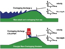 - ↑ 5.0 5.1 Van der Meer, J.W., Steendam, G.J., de Raat, G. and Bernardini, P., 2008. Further developments on the wave overtopping simulator. ASCE, proc. ICCE 2008, Hamburg. Van der Meer, J.W., 2007. Design, construction, calibration and use of the wave overtopping simulator. ComCoast, Workpackage 3: Development of Alternative Overtopping-Resistant Sea Defences, phase 3. [www.comcoast.org].
