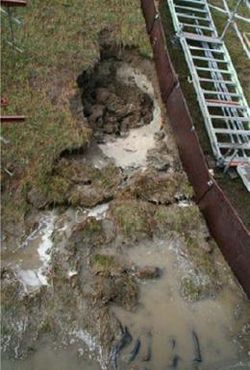 Inner slopes of a dike, covered with grass on clay, never failed by overtopping wave erosion for a mean overtopping discharge of 30 l/s per m or less. Only one section failed at 50 l/s per m; some although not all at 75 l/s per m. Large erosion resistance of the inner slope of a dike is determined by the combination of grass and clay. The grass cover seems stronger if it grows on sandy clay and may even resist up to 75 l/s per m. But if significant damage occurs, the clay layer is not very erosion resistant. Since grass roots can barely penetrate good quality clay, no strong grass cover could be found. Here grass may rip off for overtopping discharges around 30 l/s per m although the remaining good quality clay layer, still reinforced with some roots, has a large erosion resistance against overtopping waves. Therefore a good grass cover on a sandy clay and a worse grass cover on good clay show different failure mechanisms but similar strength against wave overtopping. Thus the grass sod and its way of maintenance may have less influence on the total strength than previously anticipated. Bad grass coverage (small open areas without grass) on sandy clay may show less resistance (Fig. 5). Transitions from slope to horizontal such as the transition from the inner slope to the toe of the dike are probably the most critical locations for initial and increasing damage. Damage here was initiated by a mean discharge of 10 l/s per m or more. As the damage occurred at the lowest part of the inner slope it will take time for damage to extend to the crest level and subsequently cause a dike breach. Transitions higher on the inner slope might be more critical. A hole in the layer of clay created at a large mean overtopping discharge of 50 l/s per m or more which reaches the under laying sand core, will give a very quick ongoing erosion. Although a test with a parking place of bricks showed that sand erosion at 10 l/s per m or more, goes fairly quickly (was even stopped at 30 l/s per m due to fast ongoing damage to the parking area) the dike itself was not in danger at all. Small obstacles like poles and fences did not show any erosion. Small holes from mice and moles did not initiate damage to the grass cover layer. An obstacle like a concrete staircase on the inner slope was totally destroyed at a stage with 75 l/s per m overtopping but the dike itself was not in danger.