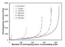 Field tests have been carried out at the end of the winter when grass roots are in their worst condition. The design and calibration of the Wave Overtopping Simulator has been described by Van der Meer (2007[5]) and the test results of the first tested dike have been described by Akkerman et al. (2007a[7] and 2007b[8]). Part of the tests in 2008 have been described by Steendam et al. (2008[9]). A summary report on all the testing in 2007 and 2008 has been described by Van der Meer (2008[6]). Each test condition was given by a mean discharge and lasted for 6 hours. Test conditions increased from 0.1 l/s per m to 1; 5; 10; 30; 50 and 75 l/s per m. A full test on a dike section took about one week and often more than 14,000,000 litres of water flowed over the inner slope of 4 m width. Each test condition consisted of simulation of the required distribution of overtopping volumes (Overtopping Manual, 2007[1]). Such a distribution depends on expected conditions at sea: a larger significant wave height (as at sea dikes) will show fewer overtopping waves, but the volume in the overtopping waves will be bigger than for a smaller wave height (as for example at river dikes). All tests until 2009 have assumed a significant wave height of 2 m with a wave steepness of 0.04 (using the peak period). In 2010 also tests have been performed with a significant wave height of 3 m and 1 m. Distributions of overtopping volumes for this condition and for various mean discharges are given in Figure 4.