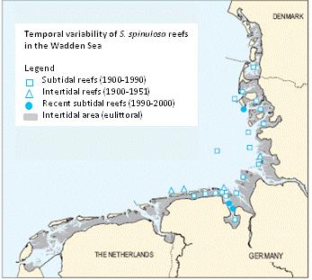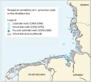 Changing occurrences of S. spinulosa reefs in the Wadden Sea (Wadden Sea Secretariat, 2005). Figure adapted from OSPAR 2010.
