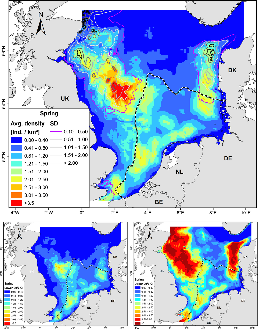 Figure 4 - Predicted harbour porpoise densities during spring (source: [http://onlinelibrary.wiley.com/doi/10.1002/ecs2.1367/full hdl.handle.net/10.1002/ecs2.1367]).