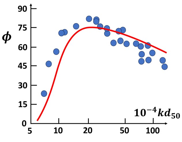 Dronkers J (talk | contribs) (The phase lead angle <math>\phi</math> of the bed shear stress relative to the bed perturbation as a function of <math>k \, d_{50}</math>. Figure adapted from Charru et al. (2013<ref name=C13/>).) |