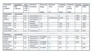 The overall accuracy is an estimate of the overall error of a single measurement due to (systematic and random) measuring errors and stochastic (fluctuation) errors related to the physical process. The latter errors are introduced by the stochastic fluctuations of the physical parameters to be measured. For example, single bottle-measurements may have an error of about 100%. This error can be reduced by using a larger sampling period or by collecting more samples. The overall accuracy of the samplers with a free sampling period, as presented in Figure 1, is based on a relatively long sampling period (say 5 minutes). The accuracy of the optical and acoustical samplers is largely dependent on the number and accuracy of the calibration samples.