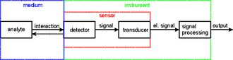 An oceanographic instrument generally consists of one or more sensors and a signal processing unit that converts the sensor signal and carries out scaling and conversion to engineering units and the output data protocol. Figure 2 shows a schematization of an oceanographic instrument. The analyte (property to be measured) interacts with the detector (in some cases after a stimulus has been exerted by the instrument). The detector produces a signal, that is transformed into an electrical signal by the transducer. Detector and transducer together constitute the sensor. The electrical signal is fed to the signal processing (and conditioning) unit that creates the signal output of the instrument.