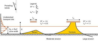 • Tombolo: When the dimensionless breakwater length LB* is greater than approx. 0.9 to 1.0, the sand accumulation behind the breakwater will connect the beach to the breakwater in a tombolo formation. But again, parameters other than the breakwater length and distance influence the accumulation pattern