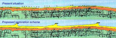 Fig. 10. Upgrading of a worn-out protection scheme at a type 2E coast (upper part) with a breakwater scheme consisting of a series of singular large coastal breakwaters with long spacing combined with initial nourishment (lower part).