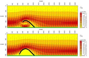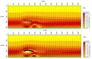 • Comparing a and b: The curved breakwater guides a larger amount of longshore current (and the littoral transport) around the structure on the offshore side, but turning the flow slightly towards the shore, it provides better bypass and less lee side erosion. The eddy in the lee area downstream of the structure is smaller for the curved structure, but it is still there. The scour hole at the lee end is evaluated to be smaller.