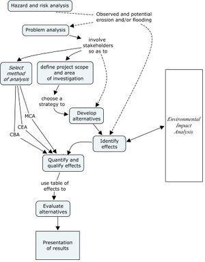 Any evaluation must have a starting point and purpose. In the case of coastal erosion projects knowledge is needed on "[Monitoring] and modeling the shoreline", "Engineering the shoreline", "Integrating the shoreline into spatial planning policies" and "Valuating the shoreline". Evaluation can be done in different phases of a project - "ex-ante", "in medias res" or "ex-post" (before, while or after a project is carried out". Regardless which phase of a project the same methods are applied. The steps of an evaluation is shown in the following flowchart: