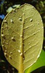 The mangroves have several functions and adaptations to a life in an intertidal ecosystem. They need to conquer some problems to be resistant to the environment. The first problem is that mangrove trees are freshwater riverine trees. They grow in an environment whose salinity ranges between that of freshwater and seawater. For this reason, they have to take up water against the osmotic pressure. To overcome the negative osmotic pressure, they generate a negative hydrostatic pressure (by transpiration processes). They developed a mechanism to exclude salt by the roots or leaves. In this way, they are tolerant for saline conditions. Even with exclusion of most of the salts, concentration of chloride and sodium ions in the tissue is higher than other plants. This high concentration can inhibit many enzymes. To protect the enzymes, the salt is stored in vacuoles. The high cation concentrations are balanced by high non-ionic solutes in the cytoplasm. Several mangrove species deposit sodium and chloride in the bark of stems and roots. Other species deposit salt in senescent leaves, which later fall off the tree. Salt glands on the leaves also exclude salt. This can be seen as salt crystals. The lower surface of the leave is highly covered with hairs to raise the secreted droplets of salty water away from the leaf surface. This prevents osmotic withdrawal of water from the tissue. They also restrict the opening of their stomata (only on the lower surface of the leaf), have a tick cuticle with a waxy layer, and orientate their leaves to avoid the burning sun. This also reduces evaporation. Because salt tolerance is costly, a greater relative root mass is needed to recover the demand for water. When it rains, drop roots, descending from the branches, absorb the freshwater that runs down from the stem through a special superficial layer. In this way, no high-energy inverse osmosis is needed.