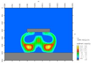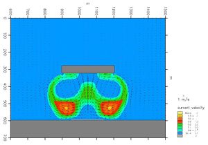 • The wave set-up on the foreshore is less in the sheltered area than outside, which generates local currents towards the sheltered area along the foreshore from both sides of the breakwater so that two eddies develop. These eddies also develop in the case of oblique wave approach.