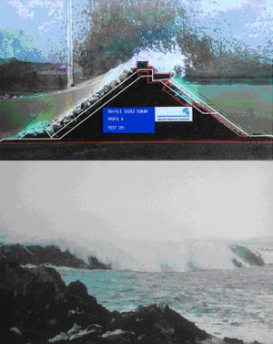 Wave-overtopping of breakwater in a flume test (upper) and in nature.