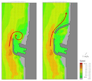The nature of the obstruction of the shore-parallel currents of course depends on the extension and shape of the coastal structure. If the structure is located within the breaker-zone, the obstruction leads to offshore-directed jet-like currents, which cause loss of beach material. If the structure is a port, the current will follow the upstream breakwater and finally reach the entrance area. The currents in the entrance area will both influence the navigation conditions and cause sedimentation, consequently the design of the entrance is important. It must provide a smooth and predictable current pattern so its impact on navigation is acceptable, sedimentation must be minimised and the bypass of sand must be optimised. The answer is a smooth layout of the main and secondary breakwaters combined with a narrow entrance pointing towards the prevailing waves.