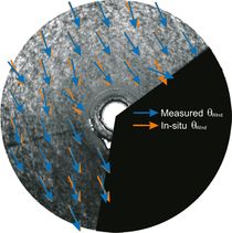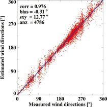 One example is given in Fig. 8. The resulting local mean directions are plotted as blue arrows. It can be seen that they agree well with the wind direction measured at the radar platform at a height of about 30 m (red arrows). For validation of the wind direction retrieval method of WIRAR, the radar-retrieved mean wind directions of 4786 image sequences are compared to the in situ measurements recorded at FINO-I at a height of 30 m. The result is given in Fig. 9: the correlation coefficient of 0.99, the bias of 0.3°, and the standard deviation of 12.8°. Investigation of the dependence of the standard deviation on wind speed shows a significant decrease of the standard deviation with increasing wind speed, as the wind streaks become more pronounced.