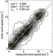A scatter plot of in situ wind speeds versus radar-retrieved wind speeds, which considers the NRCS as well as the radar retrieved wind direction, is given in Fig. 10.