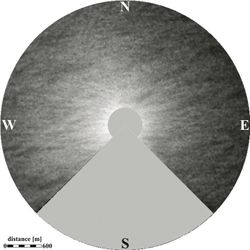 To describe the dependence of the wind speed on wind direction (determined from NRCS) and imaging geometry, a NN is utilized. Therefore, the mean NRCS image (image sequence integrated over time) is subdivided into subareas, with five intervals of 300 m in range, which start at a distance of 600 m and with sectors of 5° in azimuth. Reason for this subdivision is the radial gradient in radar backscatter: the intensity decreases from the centre to the border of the radar image, as visible in Fig. 4. For every subarea the mean NRCS is determined. A NN is trained which has the following parameters as input: (1) in situ measured wind speeds , (2) radar-measured wind direction, (3) the mean radar intensities in both crosswind directions, and (4) the antenna look direction. To improve the wind speed determination, the dependencies of the NRCS on additional parameters such as sea state and atmospheric stability can be considered in the training of the NN (Dankert and Horstmann 2007 [1]). Information on the sea state can be extracted from the radar datasets (Borge et al., 1999 [4]), while atmospheric stratification conditions, such as the air=sea temperature difference and the relative air humidity, need to be measured by external sensors.