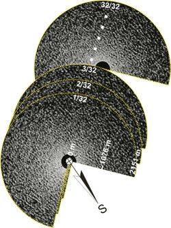 In a first step a radar-image sequence is integrated over time, typically 32 images which represents 60 s of data (Fig. 1). By this integration the wind signatures are separated from other signatures. In particular patterns are removed, which are highly variable such as ocean surface waves. In the next step, the integrated radar image is sequentially smoothed and reduced to resolutions of 20, 40, and 80 m. From each of these images, local orientations are computed from the local intensity (i.e. grey level) gradients, which are normal to the local wind directions. Only the most frequent orientations in a predefined area are selected. However, it remains a 180° ambiguity. This can be removed either by determining the motion of wind patterns in radar-image sequences or by computing the cross-correlation function (CCF), which is used to estimate the shift of moving image patterns between two images.