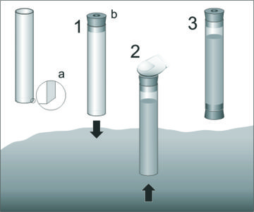 Meiofauna is usually collected from the sediment cores, obtained from a perplex tubes of 3,6 cm diameter (surface ~10 cm-2 is appropriate for all types of sediment), inserted 15 cm deep into the seabed (Figure 2). From one site six (at least three) replicates are taken. Sediment is gently pushed out from the tube and cut into the slices. Te slices are usually taken from particular layers: 0-1, 1-2, 2-3, 3-4, 4-5, 5-10 and 10-15 cm. Sometimes core is cut every 1 cm into even slices. Each sediment slice (subsample) is placed into the separate jar, fixed with 4 % neutral formaldehyde solution and stained with Bengal Rose, to obtain a pink/reddish color of the sample. For extraction of meiofauna from sediment are used two methods depending of the amounts of the detritus or silt-clay in the sediment. Decantation method - when the sediment is a sand with low amounts of detritus or silt-clay. In the laboratory, each slice is placed in the 1000 ml cylinder, filled with tap water and shaken vigorously, to suspend the sediment grains. The water is then filtered through 0.030 mm screen, and the procedure of shaking and flotation is repeated 10 times. All meiofauna organisms are retained on the screen, are gently washed into the Petri dish with measuring grid on the bottom and counted under the low power stereo microscope. Density gradient centrifugation method - the extraction from mud or detritus is most efficiently using a density gradient in a centrifugation procedure (Heip et al. 1985). In this method liquid with a density larger than the density of meiofaunal organisms can be used (Ludox, density of 1.15) The method consist: placement of sediment sample into the Ludox solution, centrifuge it with 1800 g for 10 min. The meiofauna organisms are retained in the 'gel', once the sediment is on the end of the tube. Repeat centrifugation three times more. This method does not work for heavy foraminifera, since their density is often equal to the sediment grain. In the lab, the meiofauna organisms are counted on the measuring grid and identified.Adaptations to Sandy Biotope