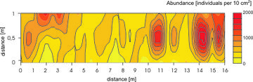 Large numbers of microscopic organisms occupy the system of interstitial canals. This porous system averages 40% of the total sediment volume. On the average abundance of metazoans organisms amount to 106 – 108 individuals per square meter.These values vary according to season, latitude, exposure, grain size etc. Populations of sandy beach animals are not randomly distributed, of course. The majority of the meiofauna has been found in the upper 2 cm layer. And this vertical zonation is mainly controlled by redox potential discontinuity level. Across sandy habitats species are also often restricted to certain zones – horizontal zonation. Additionally it is well known meiofauna is patchy distributed, even in very small scale, but causes of such distributions are still difficult to define (Figure 4).