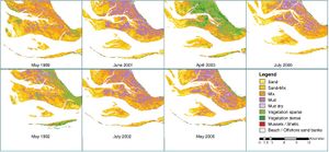 The HIMOM book of protocols, case studies and demonstration material is all available on the HMM-CD for practical use. The application of the methods in 5 different European Estuaries enabled a good comparison of methods and estuary characteristics (Fig. 3). Time series of intertidal flat classes can show changes in morphology and changes in sediment types over several years. Further, seasonal changes can be detected concerning the growth and extension of micro- and macrophytes (Fig. 5), assuming the availability of several images within one year. The availability of data is one of the constraints when using remote sensing methods for the interpretation of inter- tidal flats because, besides cloud coverage, also the tidal situation limits the number of images per year.